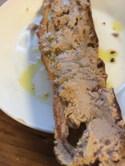 ガリッと焼いたロデヴに片面にニンニクをこすり付け、オリーブ油をかけ、おいしい塩をパラリと…。