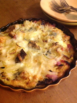 ・硬くなったロデヴを大きめの角切りにし、キッシュのアパレイユを作り、炒め玉ねぎやハムなどと一緒にキャセロールで焼き、ロデヴのキッシュ風を作ってみました!